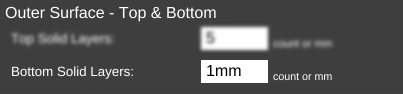 The number of layers or the distance in millimeters to solid fill on the bottom surface(s) of the object. Add mm to the end of the number to specify distance in millimeters.