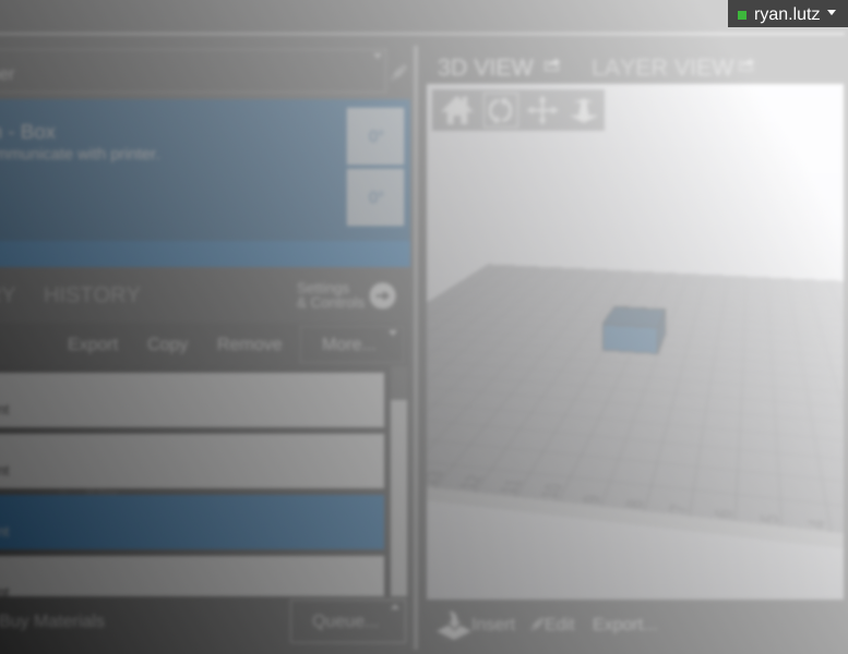 When a user is signed in, the user name is shown with a colored square to its left to indicate the status of the connection to MatterControl's Cloud Sync services. A small triangle to the right of the user name is a drop down menu containing