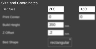 In this example, the size of the print bed is 200 mm along the X axis and 150 mm along the Y axis.
